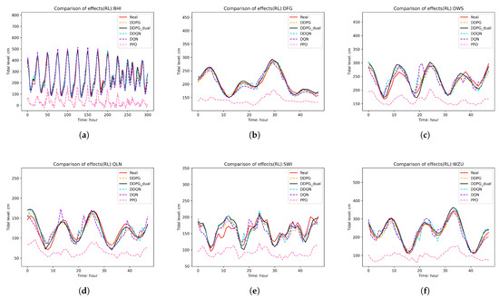 (2) Qualitative Comparison: We also plotted the prediction curves of each model. Figure 7 shows the prediction curves of the deep learning models compared against the ARIMA model, while Figure 8 presents the prediction curves of the various fusion models. In Figure 8, for each subplot, the red solid line represents the real tide level curve, and the black solid line represents the prediction curve of the DDPG_dual model. From the figure, it is clear that the DDPG_dual model generally fits the real curve quite well. In most cases, compared to the DDPG model, it is able to more accurately capture the peaks and troughs of the real curve, demonstrating superior predictive performance. However, there are certain time points where the DDPG_dual model’s predictions still show some shortcomings. For example, around the 10th hour at the SWI station and around the 13th h at the DWS station, there are significant discrepancies between the predicted and actual tide levels. The DQN and DDQN models, due to their discrete action selection, have certain limitations in their fusion performance compared to the DDPG model. The PPO fusion model, being the most complex of the models tested, not only requires longer training times but also has a slower convergence rate. Although some patterns in the tide level changes can be observed in its predictions, the prediction errors are large, making it difficult to meet the precision requirements for practical applications.