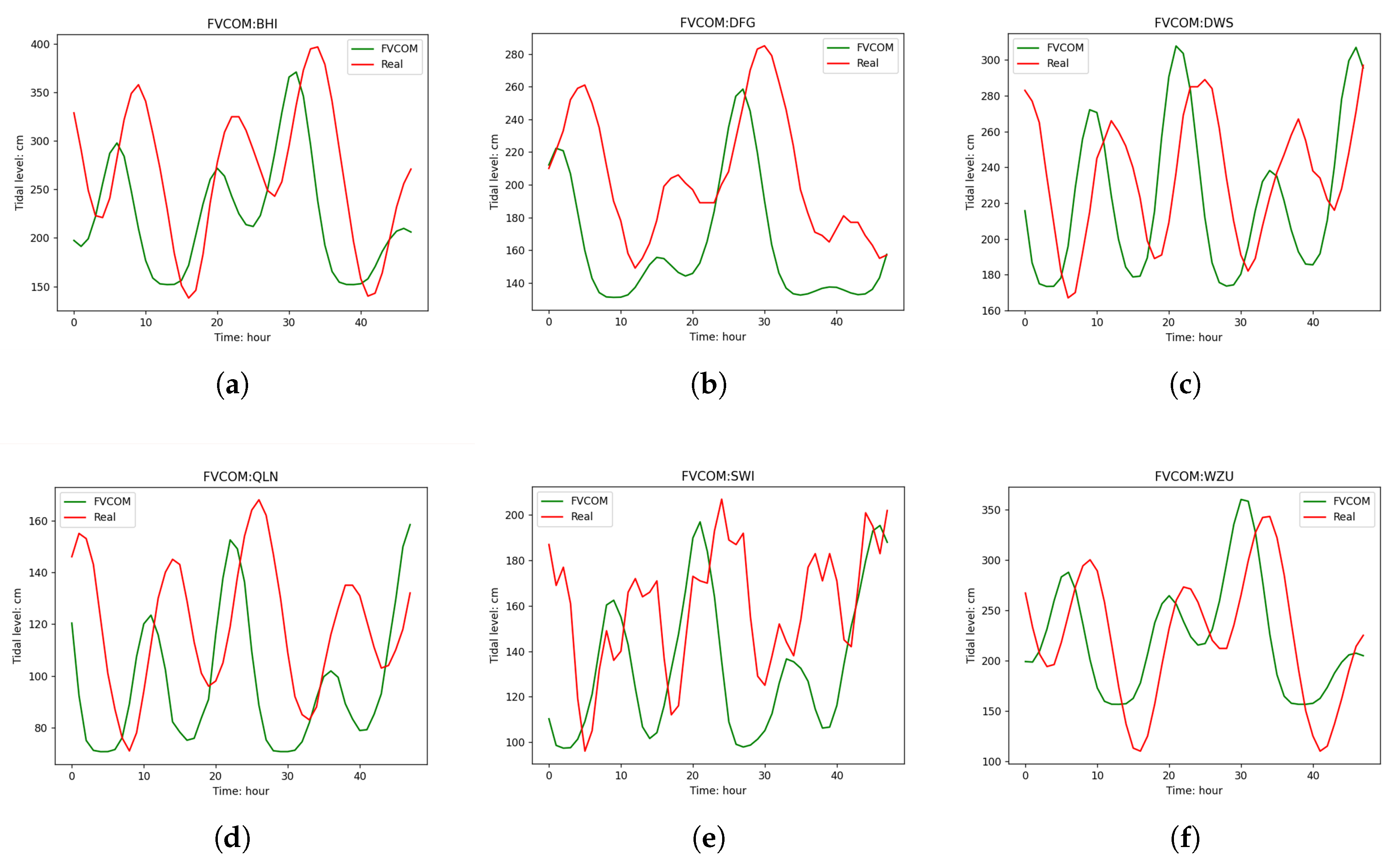 Firstly, we used the FVCOM model to predict the tidal levels at six tidal stations. Since FVCOM starts simulations in cold-start mode, to ensure the accuracy of the prediction results, we discarded the first 48 h of data after the simulation began and selected the subsequent 312 h of data as the FVCOM prediction results. Among these, for the five stations used for fusion model training, we specifically selected the last 48 h of data, which were not involved in the fusion model training, for display (the previous 250 h of prediction data were used for fusion model training). For station BHI, which was not involved in fusion model training, we displayed its complete 312-h prediction results. In