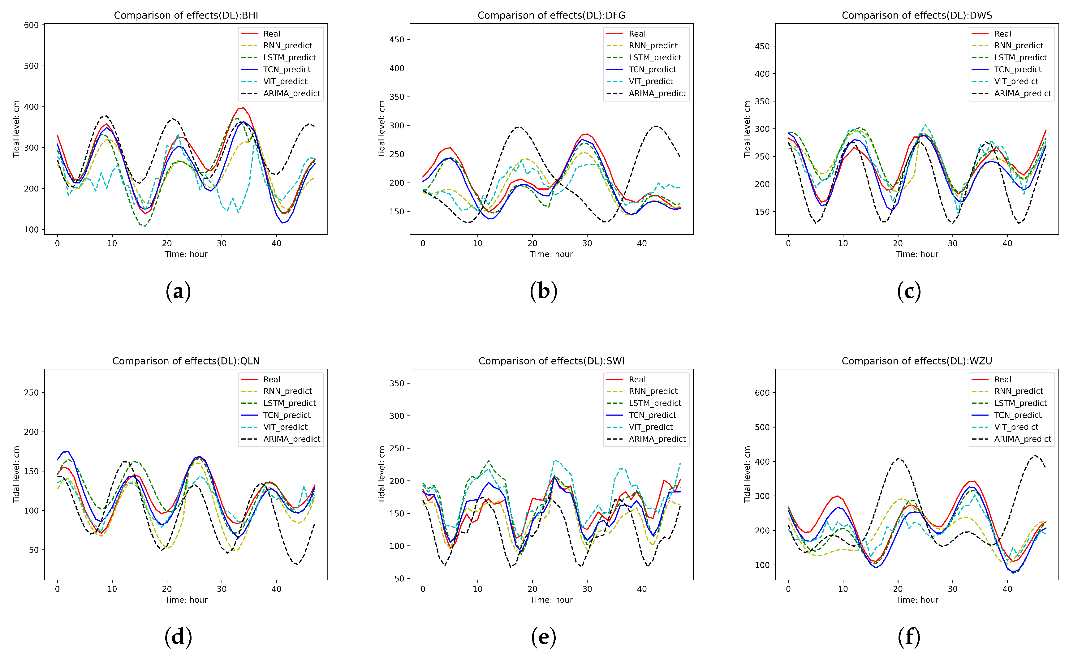 First, we compared the performance between the deep learning models and the ARIMA model. The deep learning models included TCN (Temporal Convolutional Network), RNN (Recurrent Neural Network), LSTM (Long Short-Term Memory Network), and VIT (Vision Transformer). We used these models to predict the tidal levels at six tidal stations, with the performance metrics of the models for each station shown in