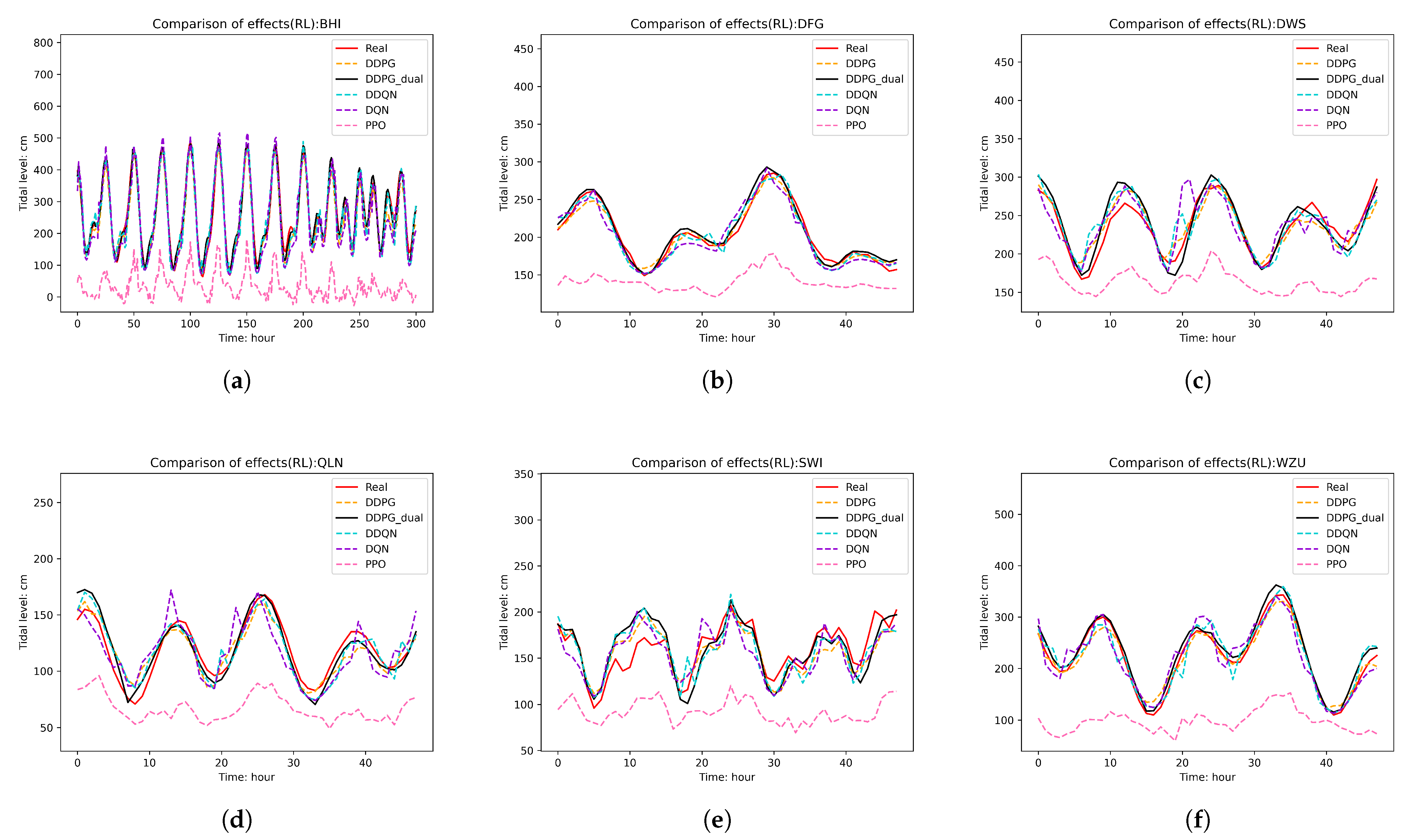 After obtaining the prediction data from FVCOM and the deep learning model TCN, we conducted a series of tests and comparisons on five reinforcement learning fusion models: DDPG_dual, DDPG, PPO, DQN, and DDQN. Specifically, we selected approximately 80% of the prediction data from five stations for training the fusion models and used the last 48 h of prediction data for fusion testing. Additionally, for the station that did not participate in the fusion model training (BHI), we used 312 h of prediction data for fusion testing. The results are presented in
