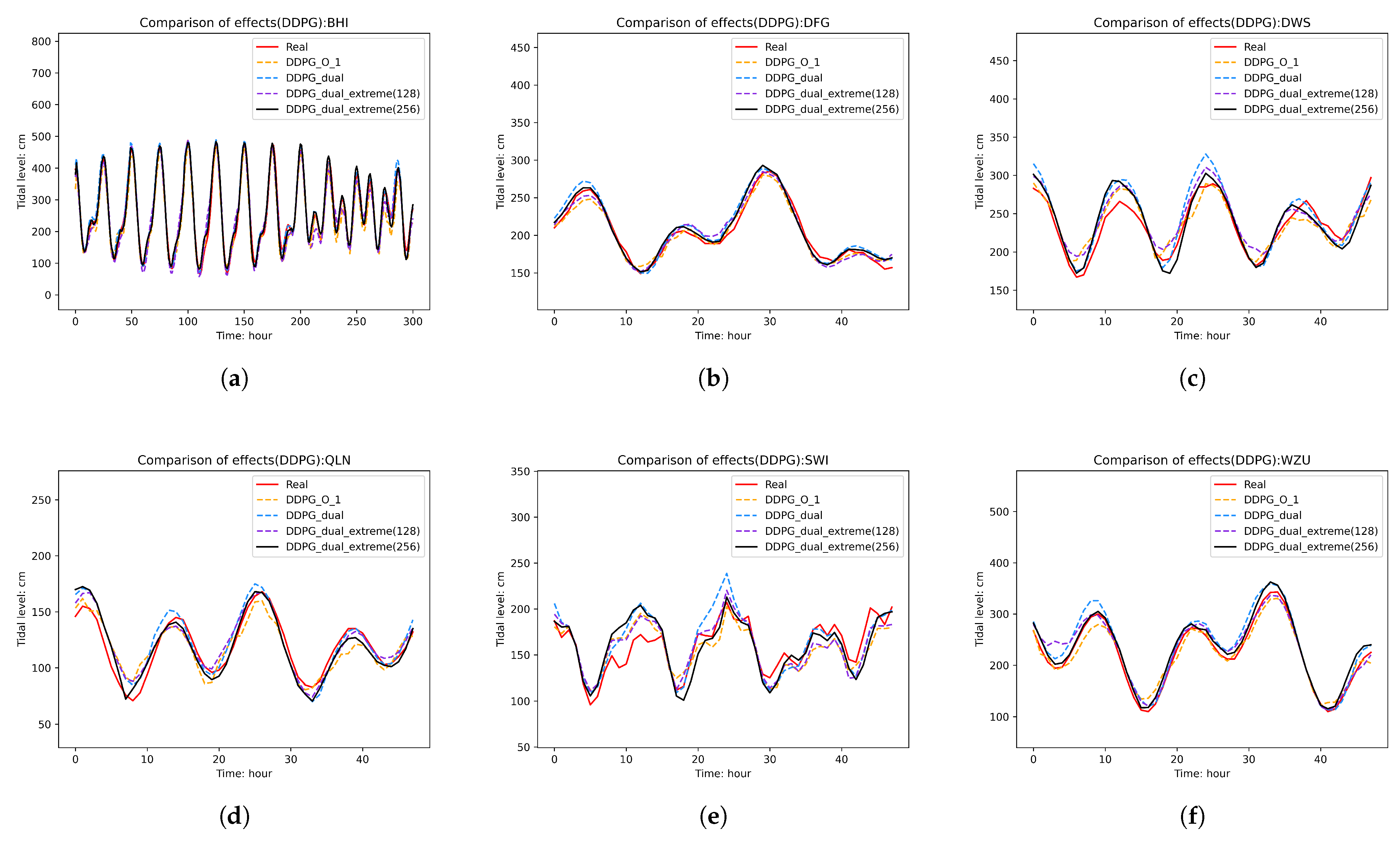 Overall, the DDPG_dual model demonstrated the best predictive performance across all tide stations, outperforming both the TCN model and the DDPG model. This can primarily be attributed to the addition of a specialized module for handling extremes in the actor and critic networks of the DDPG_dual model compared with the DDPG model. This module is more effective in predicting wave peaks and troughs, leading to predictions that are closer to the real data. This will be further validated in the subsequent ablation experiments.