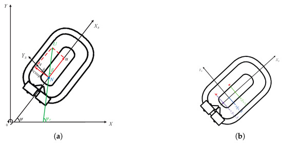 In the inertial reference frame, two feature points are defined by offsetting the point along the positive and negative directions of the body–fixed frame axis with distance b, which is shown in Figure 1b. The detailed formulas are provided below: