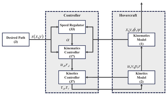 The present section develops a hierarchical control system for path following of underactuated hovercraft based on the backstepping control method. The controller architecture is depicted in Figure 2. First, the kinematic controller generates virtual velocity commands to guarantee exponential stability of path following errors while decreasing lateral slip through a velocity regulator. Second, the kinetic controller designs control inputs based on the virtual commands to ensure closed-loop stability. The proposed design effectively reduces the influence of the sideslip angle while maintaining tracking performance.