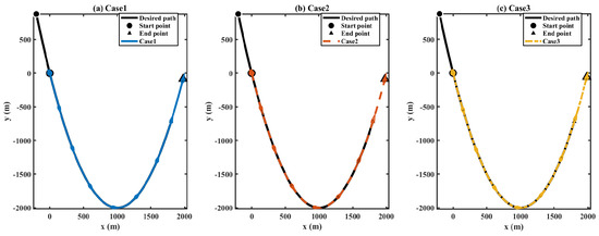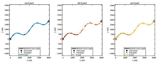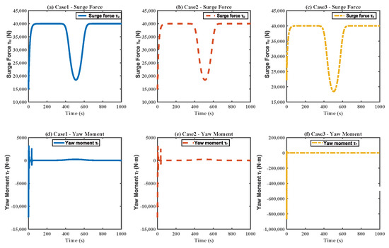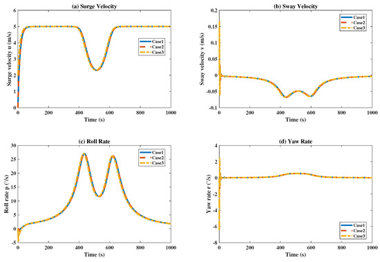 To thoroughly assess the robustness and performance of the controller under various operating conditions, three distinct case studies are designed and implemented. The first case serves as the baseline scenario, with initial states set to , , a yaw angle , a roll angle , and all initial velocities—surge velocity , sway velocity , roll rate , and yaw rate —set to zero. This original configuration provides a reference for subsequent comparisons.The second case investigates the effect of variations in initial attitude by maintaining the same initial conditions as the baseline except for an increased roll angle of . This scenario is intended to evaluate the controller’s sensitivity to changes in initial orientation. The third case introduces a non-zero initial surge velocity, specifically , while keeping all other initial states consistent with Case 1. This allows an examination of the controller’s behavior under dynamic initial motion conditions. The simulation is executed over a total time of s with a fixed integration step size of s.