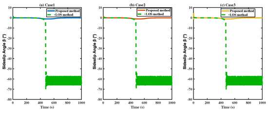As shown in Figure 6, the proposed control algorithm demonstrates significant advantages over traditional LOS guidance in sideslip angle management. While the traditional LOS guidance exhibits severe sideslip angle deterioration, dropping to approximately −60° to −70° after 500 s, the proposed algorithm maintains excellent sideslip control throughout the entire navigation process. During straight-line navigation, the proposed method keeps the sideslip angle stable within ±0.5°, and even during turning maneuvers, it only reaches a maximum of −3°. This represents a dramatic improvement over the traditional approach, where large sideslip angles can compromise both navigation accuracy and vehicle stability. The coordinated action of dynamic speed regulation and attitude control in the proposed algorithm achieves superior sideslip reduction while maintaining precise path following performance, demonstrating clear superiority over conventional LOS guidance methods.