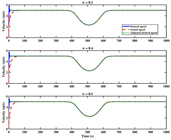 Simultaneously, an analysis of the weighting factor is conducted. As shown in Figure 10, Figure 11 and Figure 12, the weighting factor w in the optimization formulation demonstrates a significant influence on system performance characteristics. Smaller values, such as , emphasize path tracking accuracy with minimal following error; medium values, such as , achieve a balanced performance between tracking precision and sideslip suppression; larger values, such as , prioritize speed regulation capability. The comparative analysis reveals that all three configurations maintain satisfactory control performance, while provides the optimal compromise for practical engineering applications, ensuring both tracking accuracy and motion stability within acceptable operational ranges.