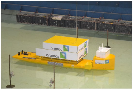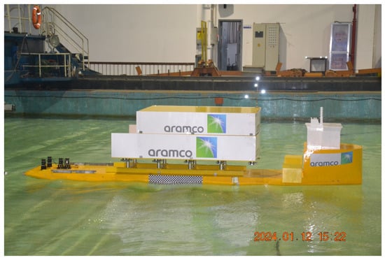 The experimental model of the semi-submersible super X-class vessel replicates key features of the prototype, including major dimensions, hull geometry, mass distribution, and inertial characteristics. The model also maintains accurate displacement values and draft measurements. The model meets ±3% of the specified prototype values for mass and moment inertia. The hull dimensions, center of gravity, and displacement are within ±1%. Major parameters of the barge are listed in Table 1, and the photo of the vessel model is shown in Figure 2.
