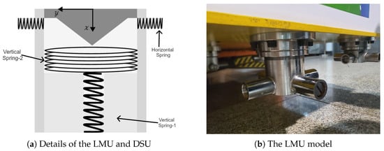 To model the horizontal and vertical stiffness, the LMU is designed as shown in Figure 3 with a local coordinate system. The DSU is installed on the deck to stabilize the topside. It functions as a shock absorber, reducing impact loads between the topside and the vessel. It restricts both vertical and horizontal movements of the topside during float-over installation. The DSU mounted on the vessel has similar components to the LMU, while the horizontal elastomer of DSUs fixed on the vessel is replaced with the friction material in the receptor cone.
