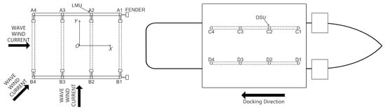 where is the vessel inertial matrix including added mass, and and are the skew-symmetric Coriolis and centripetal matrices of the rigid body and the added mass. is the damping vector which is a function of the relative velocity vector between the vessel and current. For DP and low-speed maneuverings, linear and nonlinear damping is a feasible approximation, which may be referred to in Fotuhi et al. [22]. is the generalized restoring vector caused by buoyancy and gravitation. is the actual control force produced by thrusters. is the external environmental loads, and is the impact force caused by the fender system. During the standby and docking phase, the vessel-topside system can be considered an integrated unit, and therefore, the LMU and DSU loads are excluded from this analysis.