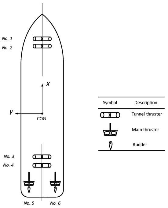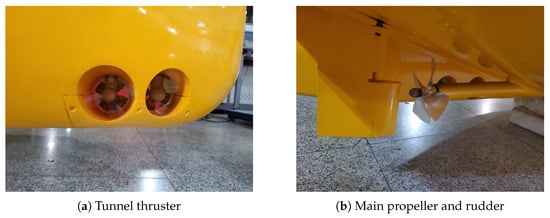 The super X-class vessel model is equipped with four tunnel thrusters (76 mm in diameter) and two main propellers (120 mm in diameter) with rudders. The Ka-470 series propellers are applied in experiments. The thrust configuration is illustrated in Figure 5 and the physical thruster models can be seen in Figure 6. The location and maximum thrust are detailed in Table 2. These thrusters are controlled by the proposed improved fuzzy controller with the real-time motion data provided by a motion-tracking system. The Alpha–Beta filter is used to reconstruct the low-frequency motions from the measured data, as it only needs to adjust a few parameters and does not need the accurate system parameter. The controller then gives the control thrust based on position and velocity errors based on the thrust allocation algorithm [20]. An onboard controller receives the feedback thrust commands from an onshore system and distributes this over the thrusters. Each servo motor drives each propeller individually [21]. This model-scale DP system emulates the operational characteristics of an authentic DP mechanism, thereby producing verisimilar positioning behavior and control responses.
