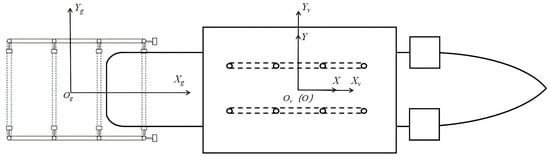 There are two coordinate systems used in docking tests: the global frame (-), and the body-fixed frame () as shown in Figure 7. The global frame is earth-fixed, and the origin coincides with the CoG (Center of Gravity) of the vessel when the vessel is fully docked. The body-fixed frame is fixed to the vessel and thus moves along with it. Usually, the position and orientation are measured in the global frame, and the velocity and loads acting on the vessel are expressed in the body-fixed frame.