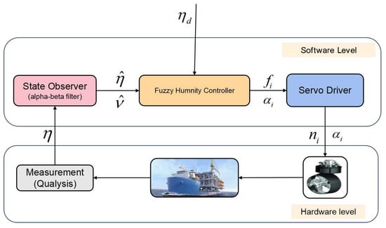 In this experimental investigation, a sophisticated non-contact optical motion-tracking system (Qualysis in the present study) is employed to record vessel kinematics under combined environmental loads, including aerodynamic forces, hydrodynamic wave interactions, and current-induced effects. The implementation of a Alpha–Beta filtering algorithm facilitates the extraction and reconstruction of low-frequency motion components from the acquired measurement data. The primary research objective encompasses the formulation of an optimal control force expression to ensure precise position maintenance and successful jacket docking. Figure 8 illustrates the structure diagram of the proposed controller system. Here, the controller includes the fuzzy controller and the thruster allocation algorithm.