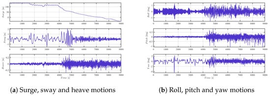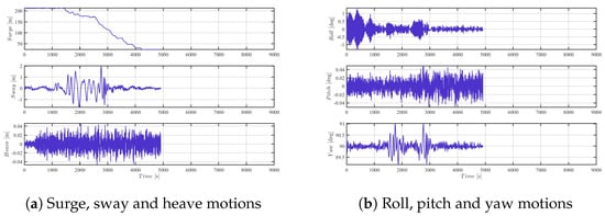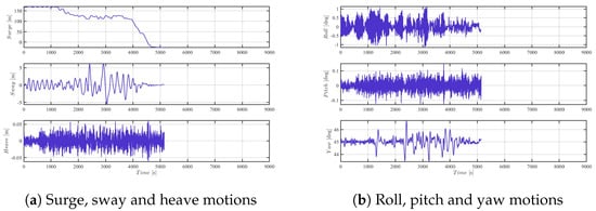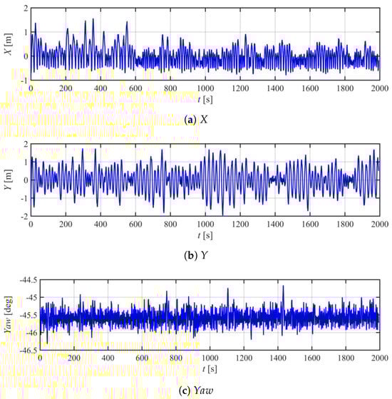 It can be seen that the vessel is well stabilized around the equilibrium position. For the positioning accuracy in the X direction, it is basically within the range of [−2 m, 2 m] for the case of 0 deg. This reduces to [−1 m, 1 m] for the cases of 45 deg and 90 deg. Because the environmental loads always come from X direction, only the two main propellers can help to keep the vessel position. The radius of the propeller is relatively large (120 mm) and must be continuously switched between forward and reverse rotation around the equilibrium, so it is very hard to achieve a better positioning accuracy. For the case of 45 deg and 90 deg, the four tunnel thrusters will work to achieve a more stable control in X direction.
