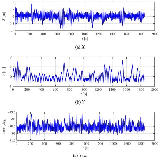 It is indicated that there is a small constant error of about 0.5 deg around the expected heading direction. The variation range of the yaw angle is basically kept in [−0.5 deg, 0.5 deg] for all the three cases. In fact, considering the scale ratio of 1:40, 2 m in the graph corresponds to 5 cm in model-scale. This positioning accuracy is very high for a nearly 6 m vessel model exposed to environmental loads.