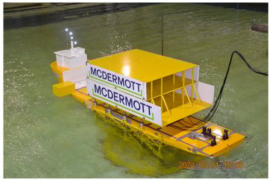 The model-scale experimental investigation is performed at Ocean Engineering Basin, Shanghai Jiao Tong University. The scaling ratio is selected as 1:40 according to the physical capability of the basin, and the Froude scaling law is adopted in the experiment. The model tests examine all the float-over installation phases, with focus on standby and docking operations. The basin measures 50.0 m in length, 30.0 m in width, with 6 m maximum depth capacity. The facility features a variable-depth bottom system (0–6 m range) and can simulate multiple environmental conditions. Motion tracking utilizes an advanced non-contact optical system to record 6-Degree of Freedom (DOF) vessel responses under combined wind–wave–current environmental loads. The 3-DoF sensors monitor fender forces throughout the tests.