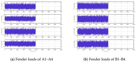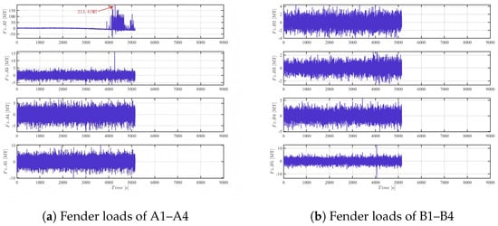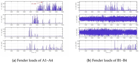 The amplitude of fender force varies greatly ranging from a few tons to hundreds of tons. The maximum reaction load is 270.8 tons, which is much larger than the results of 45 deg and 90 deg as shown later. Considering that the environmental loads come from the surge direction, the sway loads acting on the ship shall be small theoretically. This phenomenon is unexpected, as the environmental loads are primarily aligned with the surge direction, and the sway loads should theoretically be minimal. However, the observed high sway fender forces may be attributed to complex hydrodynamic interactions such as wave diffraction around the jacket structure, thruster hysteresis during rapid directional changes, and coupling effects between sway and roll motions. These effects are known to introduce lateral loads not accounted for in simplified models and have been discussed in prior studies [15,17]. Further investigation is warranted to quantify these dynamics and improve predictive accuracy.