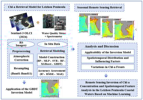 For the Leizhou Peninsula, existing studies have mainly focused on individual bays such as Zhanjiang Bay and Liusha Bay, relying on short-term and scattered cruise surveys. There is a lack of systematic and continuous spatiotemporal Chl-a concentration products covering the broader Leizhou Peninsula–Qiongzhou Strait region in recent years. Moreover, the advantages of machine learning approaches under optically complex environments have not been fully explored [,,]. Additionally, the synergistic variations of Chl-a concentration with CDOM, suspended matter, temperature, salinity, and turbidity—as well as the quantitative influence of anthropogenic activities—remain unclear. The overall technical framework of this study is illustrated in Figure 1. The main objectives are as follows: (1) to conduct seasonal offshore surveys of Chl-a concentrations, water quality parameters, and spectral data in the Leizhou Peninsula coastal waters; (2) to explore various machine learning methods and develop seasonal remote sensing inversion models of surface Chl-a concentration and (3) to investigate the seasonal patterns and influencing factors of Chl-a concentration in relation to sea surface temperature, turbidity, and salinity. Through this study, we aim to obtain a comprehensive understanding of the dynamic variations in Chl-a concentration across the Leizhou Peninsula region and provide scientific support for its ecosystem management and protection.