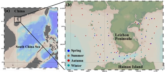 (a) Geographical location of the study area in the coastal waters of the Leizhou Peninsula; (b) Distribution of in situ sampling stations in the Leizhou Peninsula coastal waters (Generated using Ocean Data View software (Ocean Data View 5.7.2 was developed by the Alfred Wegener Institute in Germany). Blue dots represent the spring cruise in April 2021; brown dots represent the summer cruise in July 2024; red dots indicate the autumn cruise in September 2020; green dots show the winter cruise in January 2022).
