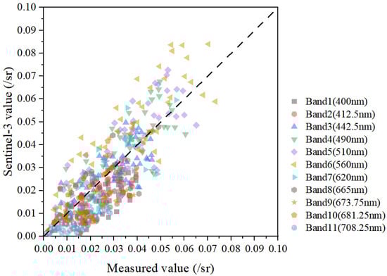Scatter plot illustrating the relationship between atmospherically corrected remote sensing reflectance (Rrs) from Sentinel-3A OLCI imagery and in situ measured Rrs.