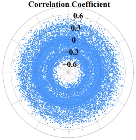 The band combinations were derived from arithmetic operations on the resampled reflectance data. Given the large number of bands, the experiment used Python algorithms to traverse all bands and construct combinations of band sums, band differences, band ratios, and multi-band parameters. In total, 19,339 band-combination correlation datasets were generated, with each combination evaluated by its correlation coefficient. The experimental results are shown in Figure 4 (the polar coordinate plot is used only for intuitive visualization of the correlation coefficient magnitude; the radial distance from the origin to the data point represents the absolute value of the correlation coefficient, while the angle has no physical or statistical meaning). Notably, some band combinations exhibited correlation values with Chl-a concentration exceeding 0.55, more than twice the correlation achieved by single bands with measured Chl-a, further confirming that band combinations can effectively enhance model prediction accuracy.