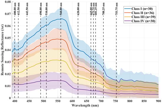 Overall, the spectral reflectance characteristics of remote sensing are significantly influenced by three main water quality factors: CDOM, suspended matter, and Chl-a, with the green and red wavelength bands being the most sensitive. Specifically, in the green band, the peak height, width, and position of reflectance vary distinctly with differences in Chl-a and CDOM concentrations. In the red band, the strong absorption valley and fluorescence peak of Chl-a further reveal the spatial distribution patterns of phytoplankton biomass. Based on this analysis and related studies, the spectra of the study area can be classified into four types (Figure 5): the first type typically exhibits a high, narrow reflectance peak in the 500–580 nm range; the second type, with a broad reflectance peak, indicates increased suspended matter content and enhanced optical complexity; the third type shows a flat reflectance curve with no distinct peak or valley and the fourth type displays a monotonous decrease with increasing wavelength. These classifications effectively reflect the optical properties and spatial variations of water quality elements in the Leizhou Peninsula coastal waters [,].