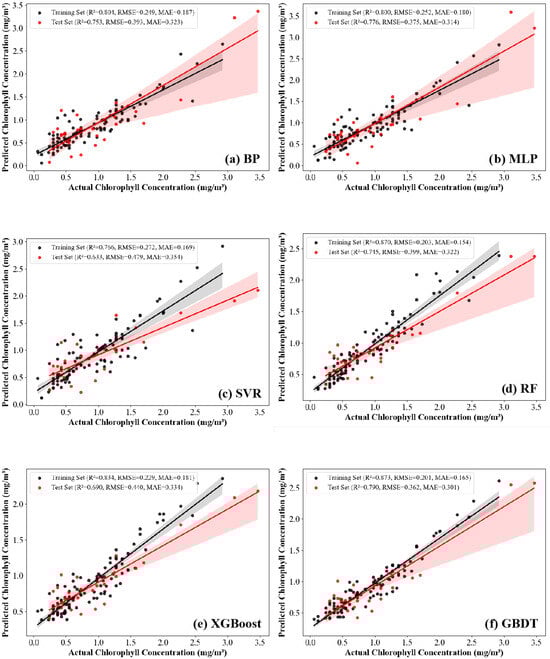 Performance evaluation of six machine learning methods for Chl-a concentration inversion: (a) BP, (b) MLP, (c) SVR, (d) RF, (e) XGBoost, and (f) GBDT.