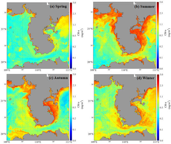 Based on the GBDT algorithm, this study conducted pixel-by-pixel inversion of Chlorophyll-a (Chl-a) concentrations in the Leizhou Peninsula coastal waters for the year 2024 and constructed seasonal spatiotemporal distribution maps. A total of 20 high-quality Sentinel-3 OLCI images were selected for the year, with five images per season. Within each season, the inversion results of the five images were averaged pixel-by-pixel to generate the seasonal spatial distribution map, effectively suppressing transient noise such as clouds and sun glint. As shown in Figure 7, the Chl-a concentration exhibits significant seasonal differences in both temporal and spatial dimensions, reflecting the spatiotemporal dynamic patterns of phytoplankton biomass with seasonal succession.