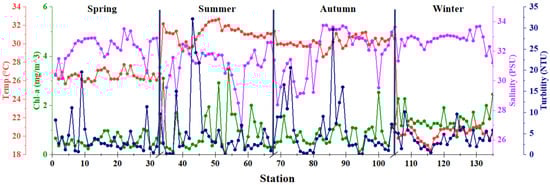 Along with changes in Chl-a concentrations, environmental factors also exhibited variations. According to the ranges and averages shown in Table 3, the average salinity generally remained high, ranging from 30.93 to 32.74 PSU. Turbidity peaked in summer and autumn, reaching 5.22 NTU and 5.86 NTU, respectively. The highest turbidity occurred in summer, likely influenced by riverine input and coupled with the influx of land-derived suspended matter. These findings indicate that phytoplankton primary productivity in the coastal waters of the Leizhou Peninsula responds sensitively to seasonal environmental changes, exhibiting notable spatiotemporal heterogeneity and ecological indicative value.