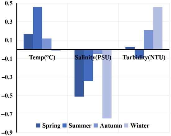 To investigate the driving mechanisms of water quality parameters on the spatiotemporal patterns of surface Chl-a concentration in the Leizhou Peninsula coastal waters, this study selected quasi-synchronously obtained in situ sea surface temperature, salinity, and turbidity data (Figure 8) to systematically assess their potential influence on Chl-a variability.