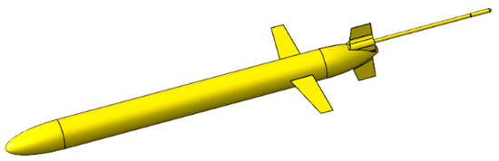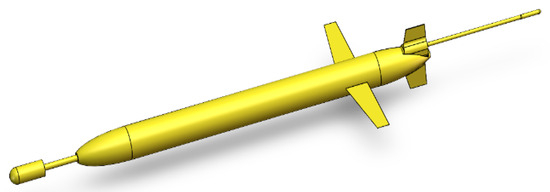 As the basis for optimization, the “Dolphin” underwater glider is selected as the computational model, with its streamlined profile shown in Figure 1. The bow section of underwater glider is equipped with an acoustic sensor module, where a vector hydrophone is mounted via a connecting rod. The main body is fitted with two carbon fiber wings positioned aft. A pair of vertically symmetric tail rudders is installed at the rear, along with a communication antenna. The platform has a total length of 4.5 m (with a manufacturing tolerance of ±0.5%), a parallel midsection length of 2.1 m, a maximum diameter of 240 mm, and a total mass not exceeding 100 kg. The design meets the hydrodynamic requirements corresponding to a Reynolds number of . The acoustic workspace reserved for the vector hydrophone is validated using SolidWorks (2019 SP0) 3D modeling, confirming a cylindrical envelope with a radius of 48 mm and a length of 200 mm, which satisfies the boundary condition requirements for multi-disciplinary coupling.