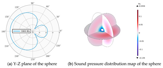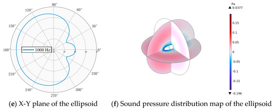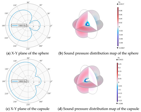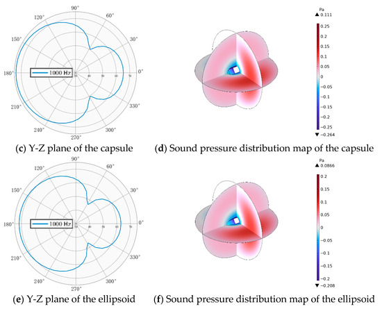 The horizontal incidence of a plane wave aims to analyze the scattering and reception behavior of the acoustic matching structure when exposed to acoustic waves incident along the positive x-axis direction. The incident frequency is initially set to 1000 Hz, and the acoustic wave is modeled as a plane wave input into the system. The X-Y plane distribution and level of scattered sound pressure under horizontal incidence of a plane wave, which are obtained through numerical simulation, can effectively highlight the characteristics of acoustic wave propagation. Figure 2 presents the simulation results. For an isotropic spherical structure, its axisymmetric property leads to negligible influence of the plane wave’s incident direction on the acoustic scattering characteristics. In contrast, for asymmetric geometries, the incident direction significantly alters the acoustic response. When a plane wave propagates along the major axis of an ellipsoid, the equivalent acoustic path differs from that of incidence along the minor axis, resulting in a noticeable shift of the characteristic frequency toward higher values. For the capsule-shaped body, consisting of two hemispherical ends joined by a central cylindrical section, horizontal incidence leads the acoustic wave to sequentially interact with regions of abrupt curvature change, resulting in complex wave mode conversions. Specifically, the front hemispherical region primarily induces specular reflection, the central cylindrical section supports waveguide modes, and the rear hemisphere generates a diffracted wave field. The presence of geometric discontinuities results in a significantly heterogeneous spatial distribution of acoustic energy, with the scattered sound pressure level exceeding that of an isotropic structure of approximately 4–6 dB.
