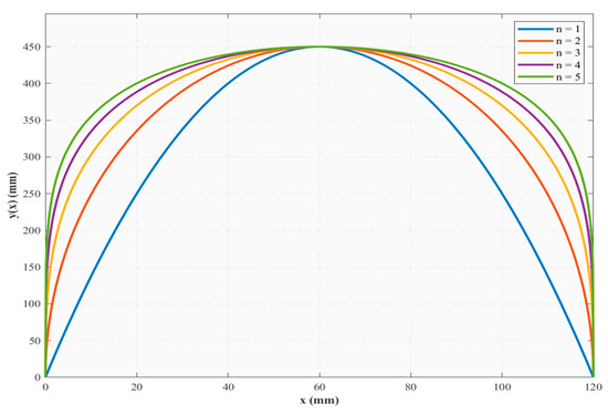 Generally, the theoretical optimal range of L/D ratios for the bow fairing of underwater vehicles lies between 0.75 and 2 [19]. Considering the geometric constraints of the vector hydrophone and its mounting structure, the L/D ratios of the forward fairing on the “Dolphin” platform are set in the range of 1.8 to 1.875, corresponding to lengths of 432 mm to 450 mm, as shown in Table 2. Meanwhile, under the constraint of a fixed total length, a series of fairing configurations with continuously varying sharpness factors n from 1 to 5 is constructed, as illustrated in Figure 4.