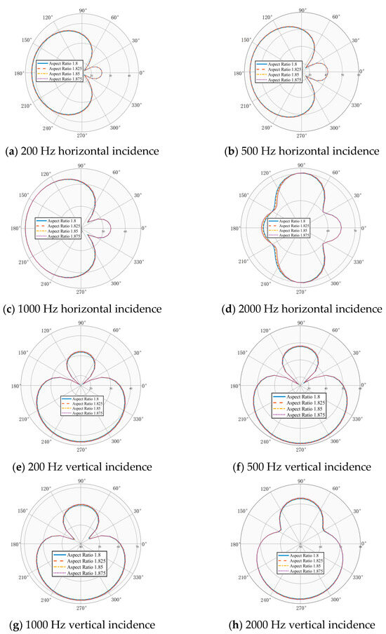 According to the acoustic structural models with varying L/D ratios listed in Table 2, simulation models are established to evaluate the structural scattering sound pressure levels under plane wave excitation at 200 Hz, 500 Hz, 1000 Hz, and 2000 Hz, for both horizontal and vertical incidence directions. The simulation results are presented in Figure 5. Numerical simulations of four Myring-type acoustic receivers with different L/D ratios reveal important characteristics of their acoustic responses. We find that within the low-frequency range, all models exhibit excellent scattering sound pressure-level characteristics, with receiving sensitivity showing a positive correlation with the L/D ratios. When the frequency is below 1000 Hz, the difference in sound pressure levels among models with different L/D ratios is less than 1.5 dB, indicating that geometric parameters have a minimal impact on the reception performance within this frequency range. As the frequency increases, the acoustic response exhibits a pronounced frequency dispersion effect. The phenomenon of scattered beam broadening causes an increase in the beamwidth of the lateral receiving channels under horizontal incidence. Moreover, the main lobe widening angle correspondingly increases with the L/D ratios. For further analysis, although beam broadening occurs in the high-frequency range, the main lobe directional deviation of all models consistently stays within ±1.8°, validating the broadband directional robustness of the proposed acoustic structure.