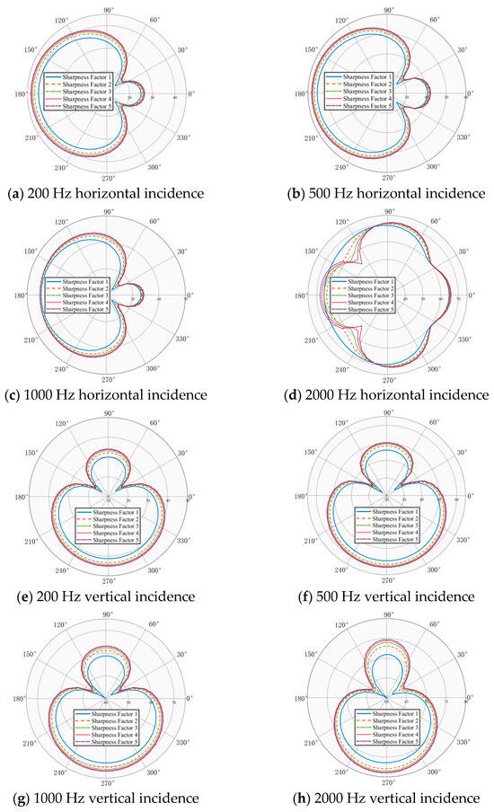 Numerical simulations are conducted using the sharpness factor models defined in Figure 4, with the results shown in Figure 6. The analysis demonstrates that the sharpness factor significantly influences the beamforming behavior of the acoustic matching structure under horizontal wave incidence. A higher sharpness factor enhances the focusing capability of the fairing. As a result, the receiving beamwidth is broadened, leading to improved target resolution and greater accuracy in azimuth localization. At a sharpness factor of 1, the receive beam reaches its minimum width. Nevertheless, multi-target detection experiments show that under this condition, the azimuthal resolution error between adjacent targets increases by 15%, indicating that an overly narrow beam may lead to spatial aliasing issues in practical applications, hindering accurate target localization. Under high-frequency horizontal incidence, increasing the sharpness factor reduces the sidelobe level, which greatly enhances the sonar system’s anti-interference capability in complex environments. This reduces the likelihood of false detections caused by interference received through sidelobes, thereby improving the overall reliability and accuracy of the sonar system.