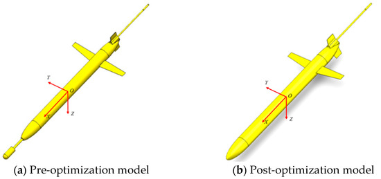 The coordinate systems for the underwater glider pre- and post-optimization are established using the internationally recognized ITTC standard coordinate system. The origin O of the coordinate system is defined at the glider’s buoyancy center. The glider’s central axis is designated as the X-axis, with the positive direction aligned with the glider’s forward navigation direction. The Y-axis is horizontal and perpendicular to the X-axis, with its positive direction pointing toward the glider’s starboard side. The direction of the Z-axis is determined according to the right-hand rule. The underwater glider’s platform is divided into the forward wet compartment, the fore cabin, the mid cabin, the aft cabin, and the rear wet compartment. Except for the forward wet compartment, all flooded compartments are connected using rib rings with the same diameter as those employed in the mid cabin. The forward wet compartment is mainly configured with the acoustic measurement unit and environmental monitoring unit. The fore cabin mainly contains the attitude adjustment unit and part of the energy supply unit. The mid cabin accommodates another portion of the energy supply unit along with the navigation and control unit. The after cabin is primarily equipped with the buoyancy-driven propulsion unit. The rear wet compartment is mainly configured with the emergency ballast-release unit, along with other supporting components. Each compartment also features relatively small protrusions and structural openings, such as drainage holes and screw holes. During the finite element modeling process, a computation-guided simplification strategy was applied to the geometric configuration of the underwater glider, wherein local geometrical details, such as functional surface apertures and ring stiffeners, are omitted. The idealized treatment effectively enhanced computational efficiency without compromising the mesh convergence requirements. The underwater glider fuselage model is shown in Figure 10a,b.