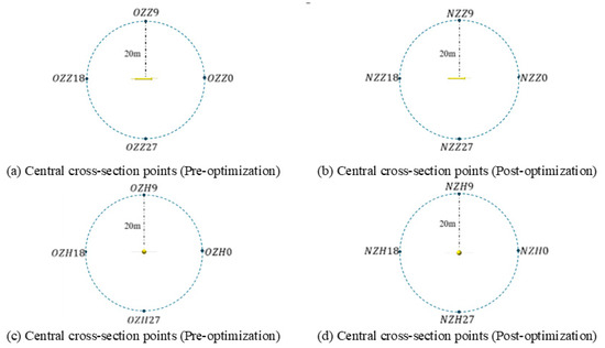 Acoustic calculations are conducted using the acoustic analogy method. After the flow field reaches a fully stabilized state, flow data from 15,000 time steps are collected for noise analysis. To fully capture the radiated noise characteristics of the underwater glider, 36 monitoring points are arranged in circular arrays on both the mid-transverse and mid-longitudinal planes, as shown in Figure 13. The monitoring radius is configured at 20 m, roughly ten times the characteristic length, to meet far field acoustic measurement conditions. With a 10° interval between each monitoring point, the variation in sound pressure with circumferential angle of the glider can be captured [20]. The locations OZH9/OZZ9 and NZH9/NZZ9 are selected as characteristic points for analyzing the patterns of sound pressure-level spectral patterns, where OZZ9 and OZH9 share the same position, as do NZZ9 and NZH9. This arrangement not only enables accurate capture of the radiation characteristics of the primary noise sources but also effectively assesses the acoustic directivity of the glider.