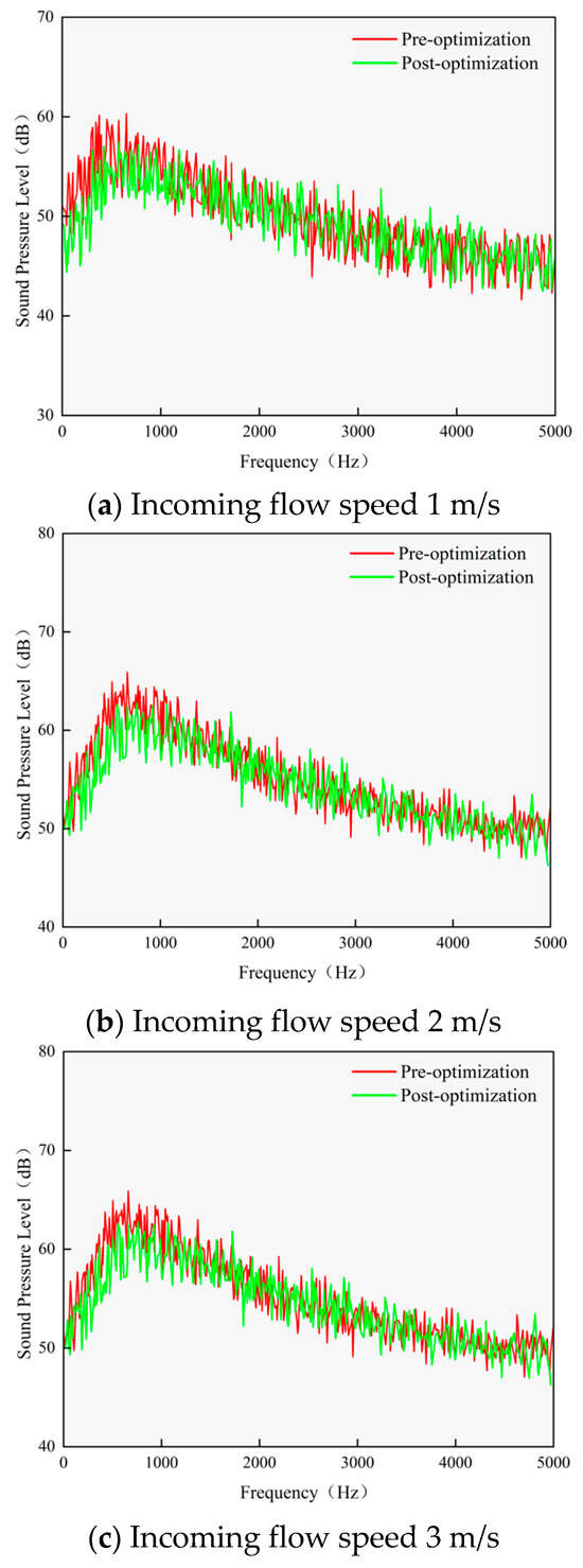 The acoustic response analysis in the high-frequency range (1–5 kHz) shows that noise reduction effects remain at 2.9 dB (at 1 m/s) to 2.3 dB (at 3 m/s) at 1 kHz. However, beyond 2 kHz, the noise reduction decreases to less than 1 dB. This is mainly attributed to two underlying mechanisms. Firstly, high-frequency noise corresponds to small-scale turbulent fluctuations that are less affected by the bow’s geometric parameters. Their acoustic radiation efficiency decreases with increasing frequency. Secondly, the flow stabilization effect induced by bow optimization has a more pronounced impact on large-scale vortex structures. Moreover, the variation in sound pressure level with increasing speed shows marked nonlinear trends. At 3 m/s, the sound pressure level reaches 68.6 dB at 100 Hz, which is 10.7 dB higher than the 57.9 dB measured at 1 m/s. This result is consistent with the trend predicted by classical Lighthill’s acoustic power theory.