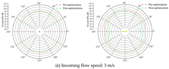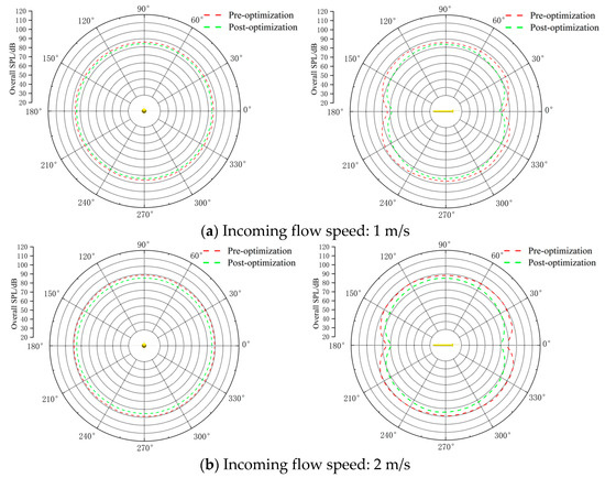 where , , , represent the sound pressure levels at different frequencies, respectively. The total sound pressure levels at key nodes for different speeds are calculated based on the OSPL. The results are presented in Table 5. The total sound pressure levels at various monitoring points on the mid-transverse and mid-longitudinal planes are calculated, which results in the sound pressure directivity patterns shown in Figure 15.