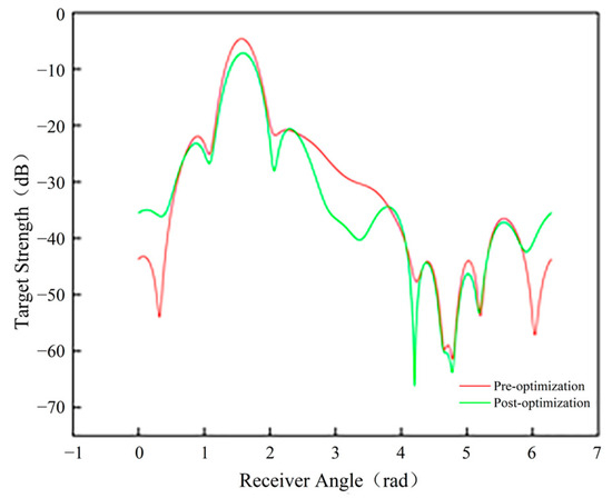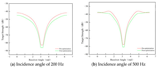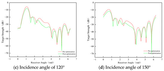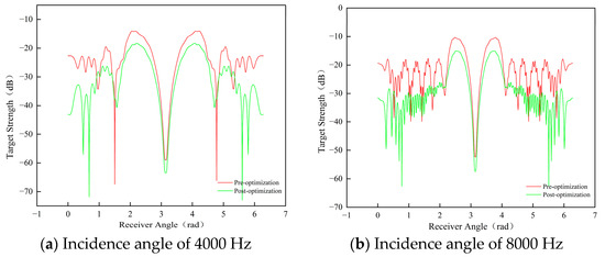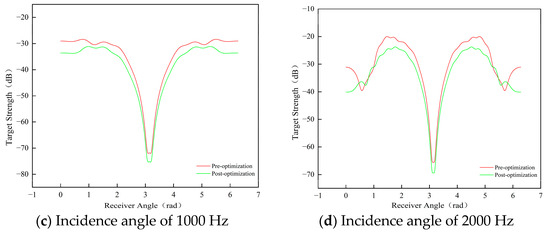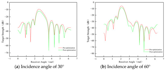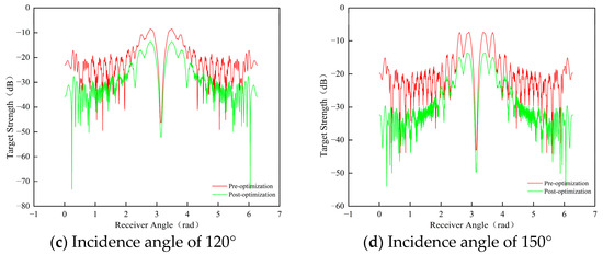 The preferred configuration exhibits lower echo strength across multiple angles, with the scattered sound pressure-level distribution appearing more uniform compared to the pre-optimization configuration. A more uniform scattering pattern indicates that the reflected signals from the target are relatively weak across different directions, resulting in reduced echo strength. This demonstrates that the design optimization effectively enhances the target’s acoustic stealth. By comparing the variations in target strength at different incident angles before and after the optimization, the following conclusions can be drawn: