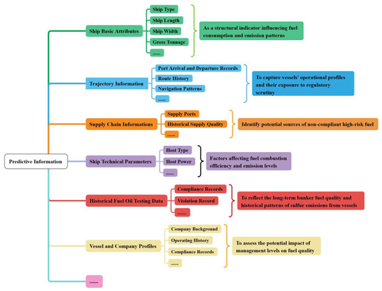 Figure 3 presents a systematic overview of the multi-source data framework employed in this study for monitoring and estimating sulfur content in marine fuels. The framework organizes the data into six distinct categories: basic ship attributes, port activities, fuel supply history, technical specifications, compliance records, and historical fuel test data. Each category contributes unique insights into various aspects of emission behavior analysis. Collectively, these features facilitate a comprehensive evaluation of ship operational patterns, regulatory exposure, fuel combustion characteristics, and operator reliability. The integration of these diverse and heterogeneous data sources constitutes the foundational basis for the AI-driven model, thereby improving its precision and real-world applicability in detecting non-compliant ships under complex maritime operational conditions.