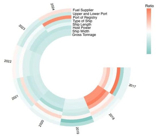 As illustrated in Figure 4, the impact of various ship characteristics on sulfur emissions demonstrates notable variation across different years. Ship dimensional parameters—such as main engine power, ship width, ship length, and gross tonnage—exhibit consistently strong correlations over multiple years, particularly in 2018 and 2024, where their regression coefficients reach relatively high levels of significance. This suggests that physical dimensions and propulsion capacity serve as key explanatory variables for sulfur emission levels. In comparison, operational and managerial factors—including fuel suppliers, upstream and downstream ports, and the port of registry—exert a comparatively limited overall influence on sulfur emissions, with their statistical significance showing temporal fluctuations. Overall, structural ship parameters constitute the primary determinants of sulfur emissions, whereas operational and managerial variables may function as secondary influencing factors under specific temporal or contextual conditions.
