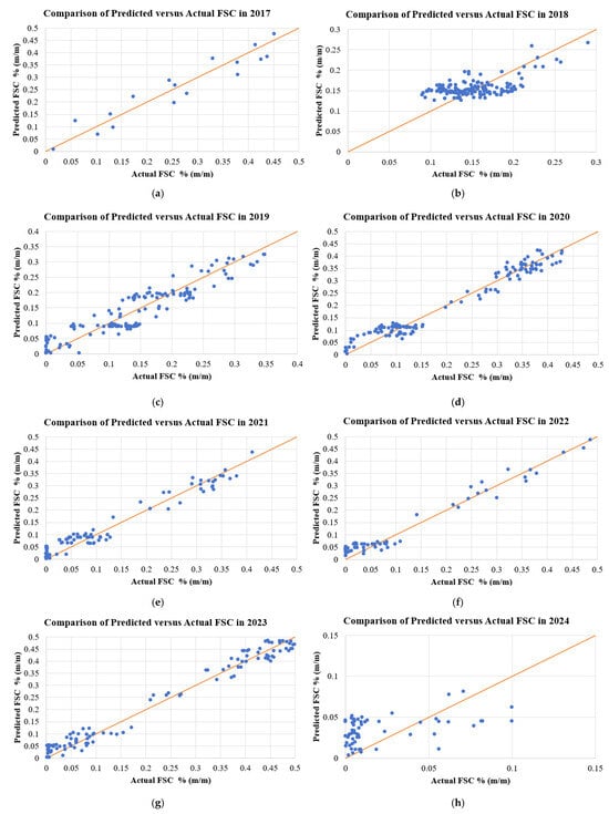 (a–h) Experimental results graph, based on an eight-year continuous dataset (2017–2024). The blue dots represent the actual FSC in comparison to the estimated values. The orange line denotes the y = x reference line for visual interpretation.