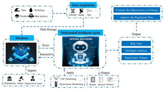 Figure 6 illustrates the workflow of an AI-driven intelligent supervision framework centered on a multimodal intelligent agent. A centralized database is constructed by collecting multi-source data—including tidal patterns, meteorological conditions, weather information, and ship records—through various devices such as drones, radars, and shore-based sniffers. This database is further enriched with relevant laws and regulations concerning ship sulfur content and information on law enforcement personnel. At the core of the system lies a multi-modal intelligent agent, which interfaces with the database to integrate and analyze the aforementioned multi-source heterogeneous data. Leveraging artificial intelligence technologies, including machine learning and natural language processing, the agent performs intelligent data analysis and risk warning. Based on the analytical outcomes, the system generates optimized supervision plans, continuously evaluates the effectiveness of current policies, and dynamically adjusts regulatory strategies. Ultimately, the intelligent agent produces structured outputs such as reports, archives, and records, along with risk estimations and intelligent risk identification results.