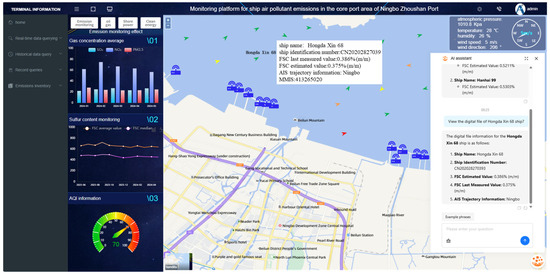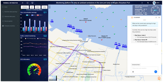 The AI agent deployed in the ship exhaust gas detection system at Ningbo Port has been put into practical use as shown in Figure 7 and Figure 8. Its functions are mainly reflected in two aspects: First, comprehensive analysis. The agent can conduct multi-dimensional feature fusion analysis on the monitored ships, integrating fuel detection data, AIS trajectories, ship attributes, and fuel supply chain information, etc., to output the estimated sulfur content of the ship’s fuel in real time. It also classifies ships based on historical compliance records, assisting regulatory authorities in targeted control. Second, intelligent screening. The system visually presents the distribution of ships within the port area on the map interface. The AI agent can automatically mark and screen out ships suspected of having sulfur content exceeding standards, indicating potential violations, thereby providing decision-making references for on-site law enforcement. Through this application, the AI agent has effectively enhanced the intelligence level of port supervision, transforming the traditional passive spot-checking model into proactive estimation and precise targeting, providing practical technical support for efficient and compliant supervision in large-scale port environments.