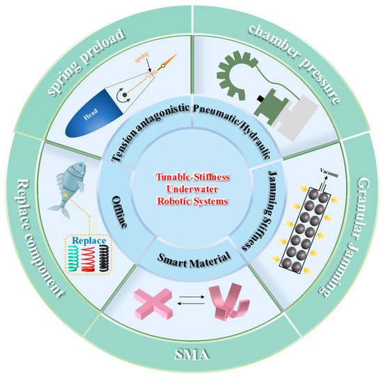 Methods for stiffness modulation in underwater robotic systems. The figure divides the variable stiffness method into five categories and lists their general areas of application. Early on, replacing components was commonly used to achieve offline stiffness. Tension-based antagonistic mechanisms, frequently utilizing springs. Pneumatic and hydraulic systems provide effective solutions for both flexible caudal fin actuation and stiffness variation. Jamming-based mechanisms typically offer simpler structures and demonstrate a broader operational stiffness range. Finally, intelligent materials represent an emerging technology within the domain of bio-inspired robotic fish. The yellow arrows indicate external loads applied to the system.
