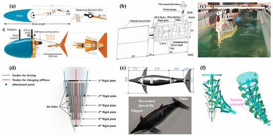 Underwater robot with a tension—counteracting adjustable stiffness structure. (a) Motor-pull [118]; (b) mobile rigid plate [122]; (c) multi-joint [137]; (d) bionic vertebra [126]; (e) equivalent spring-loaded [127]; (f) tension structural [145].