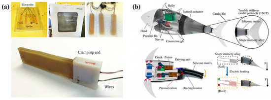 Underwater robot with a stiffness-adjusting structure using intelligent materials. (a) Electrorheological fluids variable stiffness [61], (b) SMA variable stiffness [154].