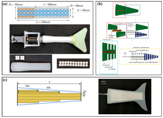 In contrast to rigid systems, flexible-structured robots utilize elastic materials (e.g., silicone, PVC, hydrogels) and soft actuators (e.g., SMA wires, dielectric elastomers) to enable continuous body deformation. This design mimics biological flexibility (e.g., fish undulation), enhancing adaptability to complex flows, as shown in Figure 3.