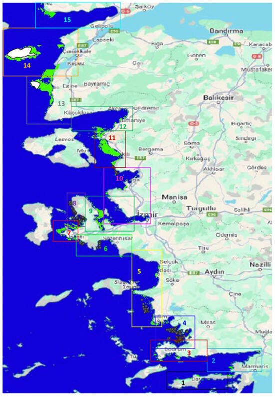 The maximum depth surveyed was generally limited to 70 m. In some areas, the ship turned back where the depth coincided with Greek territorial waters. However, on a few occasions, the vessel sailed in Turkish waters where bottom depths reached up to 200 m. The 206 kHz sound frequency used in this study is capable of penetrating depths up to 250 m, despite transmission loss due to sound attenuation over range. Steep cliffs were observed near the coastline (Figure 2). The study area includes large gulfs, bayous, and marine protected areas (MPAs), particularly within Sectors 2, 10, 14, and 15 (Figure 1 and Figure 2). Most of the larger MPAs were characterized by marine cliffs (Figure 2).