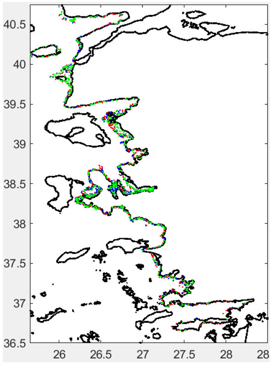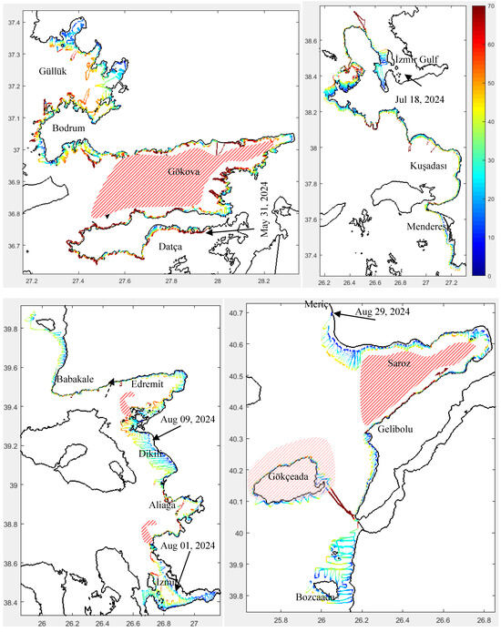 Monthly averaged surface chlorophyll-a distribution at a 4 × 4 km resolution for June, July, and August 2024 along the coastal region of the study area was provided by Prof. Dr. Ahmet Cemal Saydam from https://oceandata.sci.gsfc.nasa.gov (accessed on 10 May 2025).